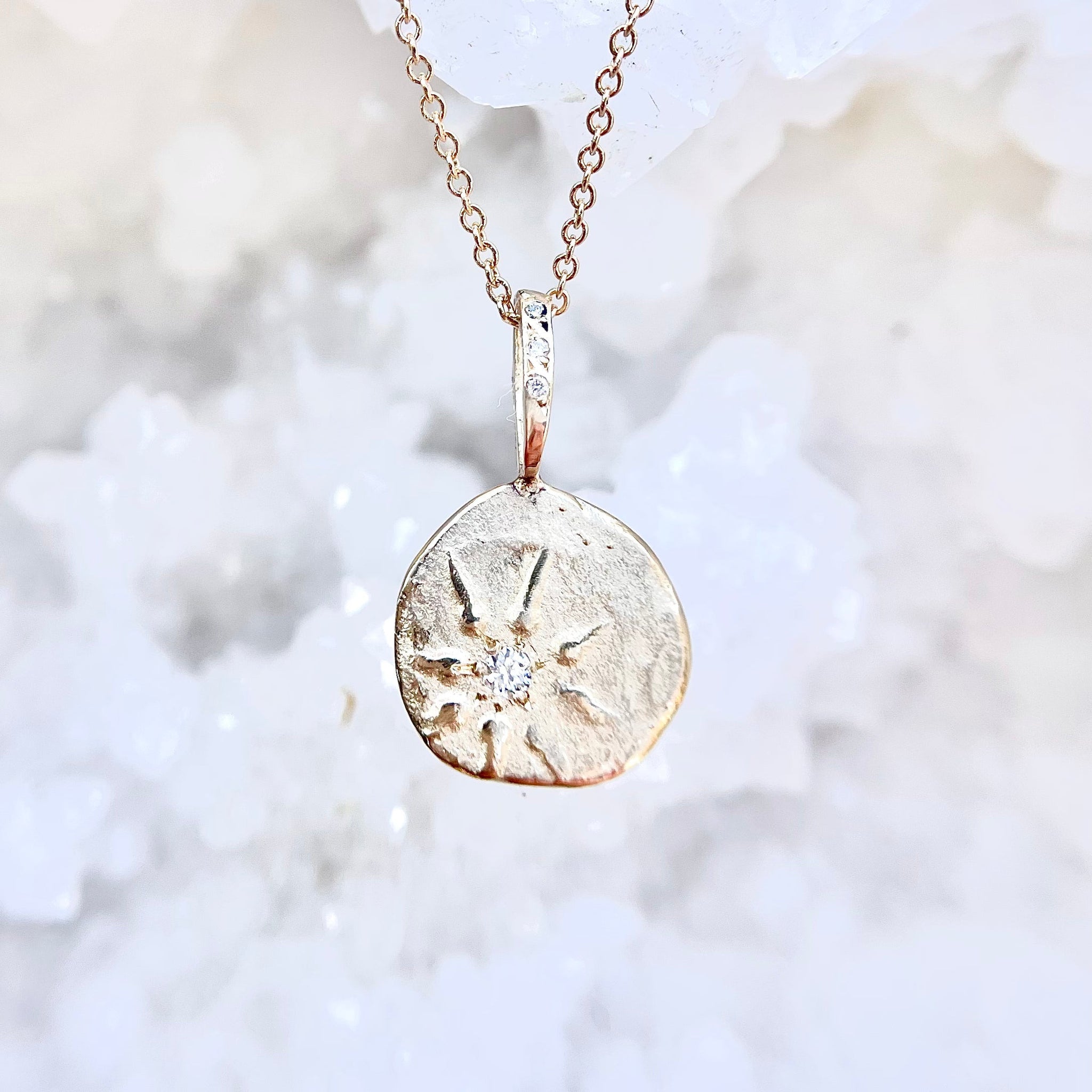 DETAILS All 14K Gold Pendant and 18'' Chain with Diamond Bail and Diamond Pendant Diameter 1/2"